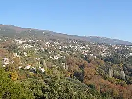 Milies (Greek: Μηλιές) is a village and a former municipality in Magnesia, Thessaly, Greece. Since the 2011 local government reform it is part of the municipality South Pelion, of which it is a municipal unit.[2] The municipal unit has an area of 63.754 km2.[3] It is a traditional Greek mountain village, at a height of 400 m on Mount Pelion. It is 28 km from Volos, the capital city of Magnesia. Milies is connected with the GR-34A (Volos - Promyri) It has traditional stone houses, cobbled roads, good restaurants and accommodation in abundance. Milies is also notable for being the terminus of the narrow gauge (60 cm) Pelion Railway, built between 1895 and 1903 by the Italian engineer, Evaristo de Chirico, father of the famous artist Giorgio de Chirico. This proved to be of considerable economic advantage to the region. The recently railway runs between Ano Lechonia and Milies twice a week at the weekend.[4] The village commands striking views across the Pagasetic Gulf and benefits from the many streams and water sources for which Mt. Pelion is renowned. These result in rich vegetation and cool, forested mountain slopes.