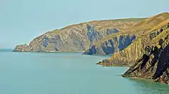 ![]() Cliffs at Ceibwr, where Nant Ceibwr flows out to sea | |