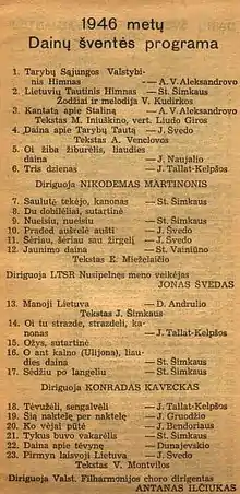 - 1 2 3 4 5 6 7 8 Marcinkevičius, Juozas (2005). "Tautiškos giesmės likimas prijungus Lietuvą prie Sovietų Sąjungos(1940-1950)". Lietuvos himnas (PDF). Vilnius: Lietuvos nacionalinis muziejus. ISBN 9955-415-23-1. Retrieved July 29, 2018.