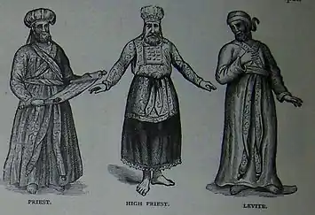 Numbers 3:5–4:20 refers to duties of the Levites. Deuteronomy 33:10 reports that Levites taught the law.[31] Deuteronomy 17:9–10 reports that they served as judges.[32] And Deuteronomy 10:8 reports that they blessed God's name. 1 Chronicles 23:3–5 reports that of 38,000 Levite men age 30 and up, 24,000 were in charge of the work of the Temple in Jerusalem, 6,000 were officers and magistrates, 4,000 were gatekeepers, and 4,000 praised God with instruments and song. 1 Chronicles 15:16 reports that King David installed Levites as singers with musical instruments, harps, lyres, and cymbals, and 1 Chronicles 16:4 reports that David appointed Levites to minister before the Ark, to invoke, to praise, and to extol God. And 2 Chronicles 5:12 reports at the inauguration of Solomon's Temple, Levites sang dressed in fine linen, holding cymbals, harps, and lyres, to the east of the altar, and with them 120 priests blew trumpets. 2 Chronicles 20:19 reports that Levites of the sons of Kohath and of the sons of Korah extolled God in song. Eleven Psalms identify themselves as of the Korahites.[33]