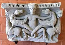 Also from Santa Maria del Popolo also come some capitals (11th and 12th century) that reflect the decorations and the shape of the Corinthian capitals of the classical age and a capital represented and seven figures that hold the character in the center, while the last of the series respectively carry a cross and a knife.[15]