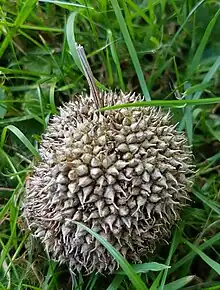 After being pollinated, the female flowers become achenes that form an aggregate ball. The fruit is a multiple of achenes (plant systematics, Simpson M. G., 2006). Typically, the core of the ball is 1 cm in diameter and is covered with a net of mesh 1 mm, which can be peeled off. The ball is 2.5–4 cm in diameter and contains several hundred achenes, each of which has a single seed and is conical, with the point attached downward to the net at the surface of the ball. There is also a tuft of many thin stiff yellow-green bristle fibers attached to the base of each achene. These bristles help in wind dispersion of the fruits as in the dandelion.
