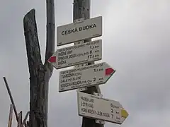 The Polish–Czech Friendship Trail (Czech: Cesta česko-polského přátelství, Polish: Droga Przyjaźni Polsko-Czeskiej) is a public walking path in the Giant Mountains. The path runs on both sides of the Czech–Polish border, along the main ridge and crosses or traverses all its summits. The maintenance of the trail is performed by the staff of both adjacent national parks: the Polish Karkonosze National Park and the Czech Krkonoše National Park. The trail is marked red and the signs mostly bilingual. The start point is located on Szrenica and the end in the Okraj pass / Pomezní boudy; the length of the trail is approx. 30 km; the level of difficulty is moderate. The trail partially overlaps with ski trails.