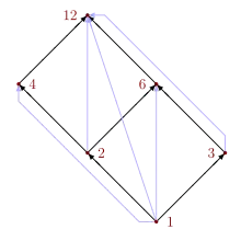 Formally, X = { 1, 2, 3, 4, 6, 12 } and Rdiv = { (1,2), (1,3), (1,4), (1,6), (1,12), (2,4), (2,6), (2,12), (3,6), (3,12), (4,12), (6,12) }. The representation of Rdiv as a Boolean matrix is shown in the middle table; the representation both as a Hasse diagram and as a directed graph is shown in the left picture.