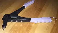 Prior to the invention of blind rivets, installation of a rivet typically required access to both sides of the assembly: a rivet hammer on one side and a bucking bar on the other side. In 1916, Royal Navy reservist and engineer Hamilton Neil Wylie filed a patent for an "improved means of closing tubular rivets" (granted May 1917).[4] In 1922 Wylie joined the British aircraft manufacturer Armstrong-Whitworth Ltd to advise on metal construction techniques; here he continued to develop his rivet design with a further 1927 patent[5] that incorporated the pull-through mandrel and allowed the rivet to be used blind. By 1928, the George Tucker Eyelet Company, of Birmingham, England,[6] produced a "cup" rivet based on the design. It required a separate GKN mandrel and the rivet body to be hand-assembled prior to use for the building of the Siskin III aircraft. Together with Armstrong-Whitworth, the Geo. Tucker Co. further modified the rivet design to produce a one-piece unit incorporating a mandrel and rivet.[7] This product was later developed in aluminium and trademarked as the "POP" rivet. The United Shoe Machinery Co. produced the design in the U.S. as inventors such as Carl Cherry and Lou Huck experimented with other techniques for expanding solid rivets.