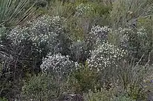 Spyridium leucopogon, commonly known as silvery spyridium,[2] is a species of flowering plant in the family Rhamnaceae and is endemic to the Eyre Peninsula in South Australia. It is a small, slender shrub with narrowly linear leaves, and heads of woolly, white flowers.