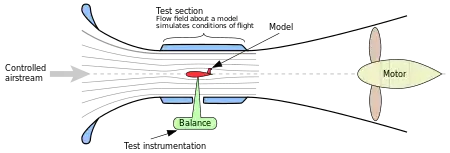 Low-speed wind tunnels are used for operations at very low Mach number, with speeds in the test section up to 480 km/h (~ 134 m/s, M = 0.4).[1][2] They may be of open-return type (also known as the Eiffel type, see figure), or closed-return flow (also known as the Prandtl type, see figure) with air moved by a propulsion system usually consisting of large axial fans that increase the dynamic pressure to overcome the viscous losses.
