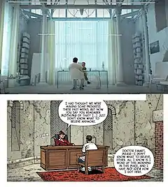The mental hospital set (top) was heavily inspired by the Moon Knight comics by Jeff Lemire and Greg Smallwood (bottom).[10]