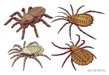 The order Trigonotarbida is a group of extinct arachnids whose fossil record extends from the late Silurian to the early Permian (Pridoli to Sakmarian).[1][2][3] These animals are known from several localities in Europe and North America, as well as a single record from Argentina. Trigonotarbids can be envisaged as spider-like arachnids, but without silk-producing spinnerets. They ranged in size from a few millimetres to a few centimetres in body length and had segmented abdomens (opisthosoma), with the dorsal exoskeleton (tergites) across the backs of the animals' abdomens, which were characteristically divided into three or five separate plates.[1] Probably living as predators on other arthropods, some later trigonotarbid species were quite heavily armoured and protected themselves with spines and tubercles.[4] About seventy species are currently known, with most fossils originating from the Carboniferous coal measures.