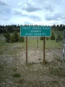 Trout Creek Pass, elevation 9,346 ft (2,849 m),[1] is a mountain pass located in the Rocky Mountains of south-central Colorado in the United States. The pass sits atop the southern end of the Mosquito Range on the Park-Chaffee county line, between South Park (the headwaters of the South Platte River to the east) and the headwaters of the Arkansas River to the west. It is traversed jointly by U.S. Highway 24 (US 24) (between Hartsel and Buena Vista) and US 285 (between Fairplay and Buena Vista). Most motorised vehicles can travel on it, and it is only ever closed during really bad winter storms. While the south side has a moderate 5% gradient, the approach from the north is gentle.