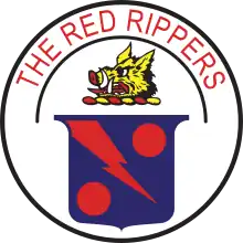 The Red Ripper squadron insignia as described by an early member: "The boar's head is taken from the one that graces the label of the Gordon's Gin bottle. The scroll effect under the head is a string of link sausage, a good line of bologna which all members of the squadron were to be adept at 'shooting.' The balls on the shield might be called balls of fire; actually, they were supposed to typify good, strong masculinity. The bolt of lightning was the bar sinister of bastardy. The whole theme was worked into a sort of toast or creed with which the squadron members were to begin and end all good drinking bouts. The official Ripper toast is, 'Here's to us, the RED RIPPERS – a damn bunch of gin drinking, bologna slinging, two-balled, he-man bastards'." In 2011, while on liberty in Bahrain, high ranking authorities declared the toast inappropriate and offensive; the toast was banned shortly thereafter. Slowly since, the toast has returned in more informal settings.