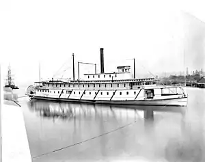 In April 1878, fitting out of the vessel was completed.[4][15][16] It was at this time that the Gates hydraulic steering gear was installed, with Wide West being the first vessel it was fitted on.[4] The initial trip of the vessel, in a fully completed state, occurred on April 16, 1878.[14] At this time, the vessel was moored opposite Swan Island to be photographed by Joseph Buchtel (1830-1916), a well-known photographer.[14][17] The public was invited on board on the afternoon of the initial cruise, on April 16, to view the newly completed steamer.[14]